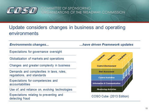 COSO更新其原始框架的目的之一,旨在反映目前商业和运营环境的变化。例如,自1992年版本框架发布至今,所发生的环境变化包括:更加关注治理问题;更加注重风险和以风险为基础的方法;更加依赖创新和复杂的技术;更加复杂的组织结构和商业模式(包括外包商业关系);层出不穷的监管要求;推陈出新的报告要求,且不再限于财务报告本身。此外,我们也看到了大规模的治理和内部控制失效事件所带来的巨大影响,包括90年代金融衍生产品的彻底崩盘、美国长期资本管理公司(Long-Term Capital Management)事件、安然丑闻及较近期的全球金融危机。这些失败案例在很多方面都为我们上了宝贵的一课,例如,管理层僭越控制、利益冲突、缺乏职责分离、透明度不足或欠缺、风险管理未加统一协调、董事会监督无效,以及会导致职能失调和/或渎职行为的薪酬结构失衡等等,都会对企业产生影响。虽然没有哪个内部控制框架能够应对上述所有问题,但自COSO发布其1992年版本框架后,企业就能够以更加积极的方式应对所发生的事件。